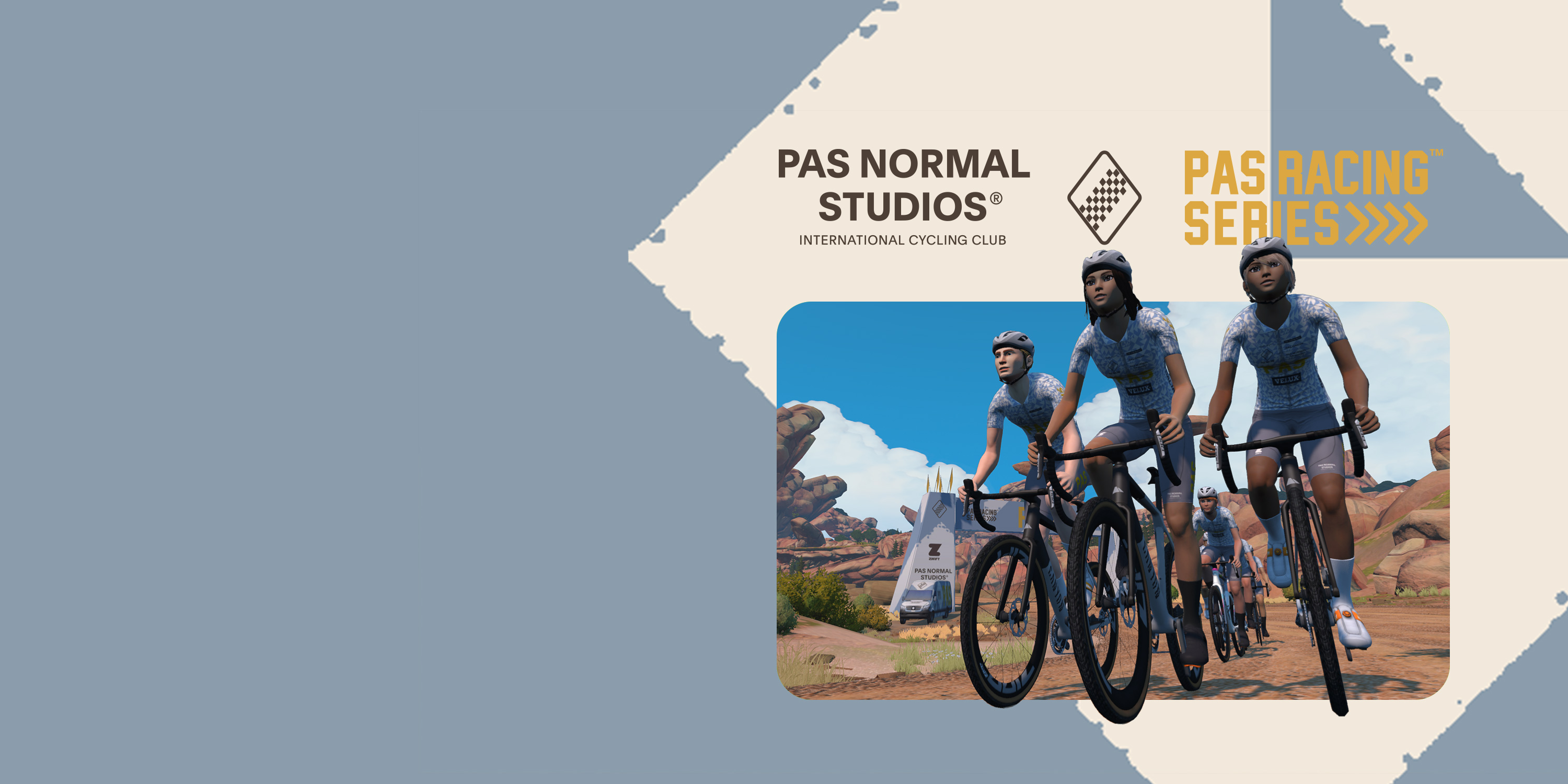 Pas Normal StudiosのスピリットとスタイルをZwiftで体験!全4ステージで争うPAS Racing Gravel Seriesは、エキサイティングなグラベルルートが目白押し。一緒にスタートし、一緒に苦しもう。